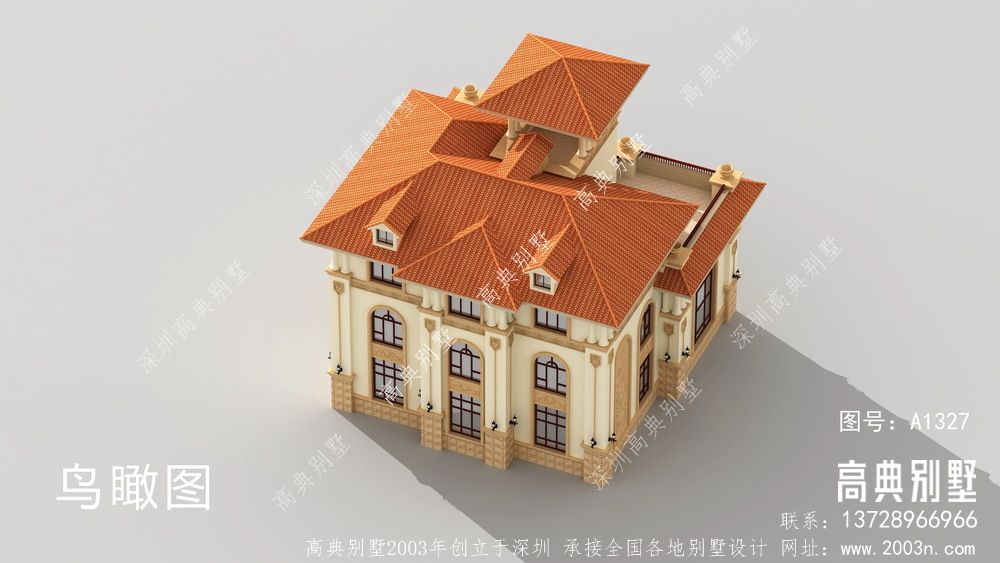 A1327号别墅设计图纸及效果图介绍:占地规格:门面13.8米X深度16.2米(未计凸出的台阶长度0.8米)