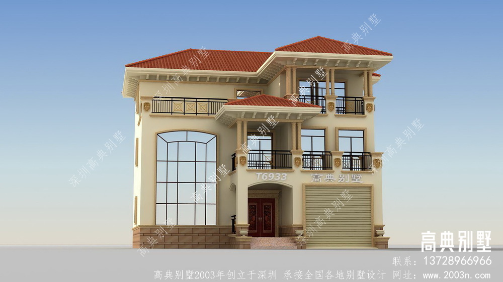 T6933号别墅外墙主要材料:天然岩石漆、天然砂岩石板材、天然砂岩石浮雕、310X310 S瓦、GRC水泥构件、铁艺栏杆
